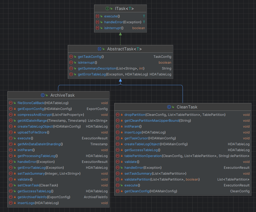 从上图可以很清楚的看出这几个类之间的结构,ArchiveTask和CleanTask作为具体的实现类,继承了抽象类AbstractTask,抽象类又实现了一个ITask的接口,接口中定义了算法中必须要实现的方法,强制性的定义了算法的必须要实现的方法,具体的任务执行方法execute和错误处理方法HandleError就要在两个子类中分别进行实现了,抽象类中提供了三个模板方法分别是isInterrupt、getSummaryDescription和getErrorTableLog,这是三个通用的方法,抽象出来放在父类中。
