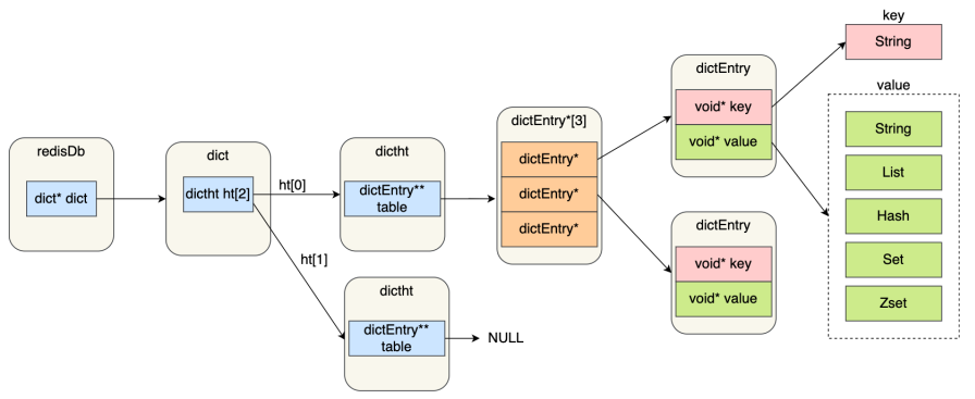 在Redis中,键是String类型的,而对应的值则可以是任何的Redis中的数据类型,比如String、list、set、zset、hash等。哈希表中并不是直接存放值本身,而是通过void * key和void * value指针,分别指向实际的键对象和值对象,所以无论值是什么类型的,都可以通过指针来找到。