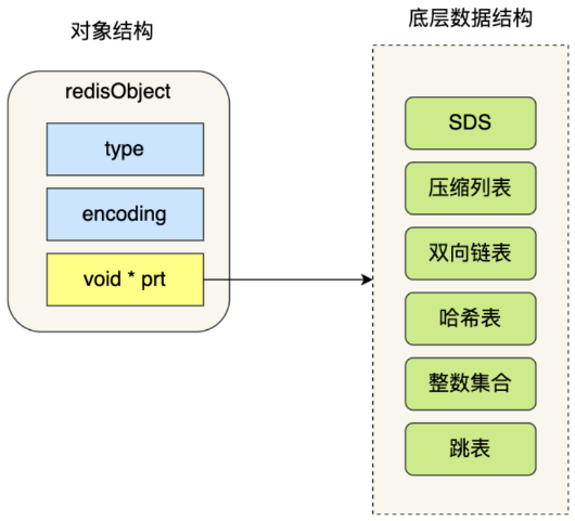 void * key和void * value指针,* key指向 的是 String 对象,⽽* value则可以指向 String 对象,也可以指向集合类型的对象,⽐如 List 对 象、Hash 对象、Set 对象和 Zset 对象。void * key和void * value指针指向的是Redis对象,Redis中的每个对象都是由redisObject结构来表示的,具体结构如下图:![]()